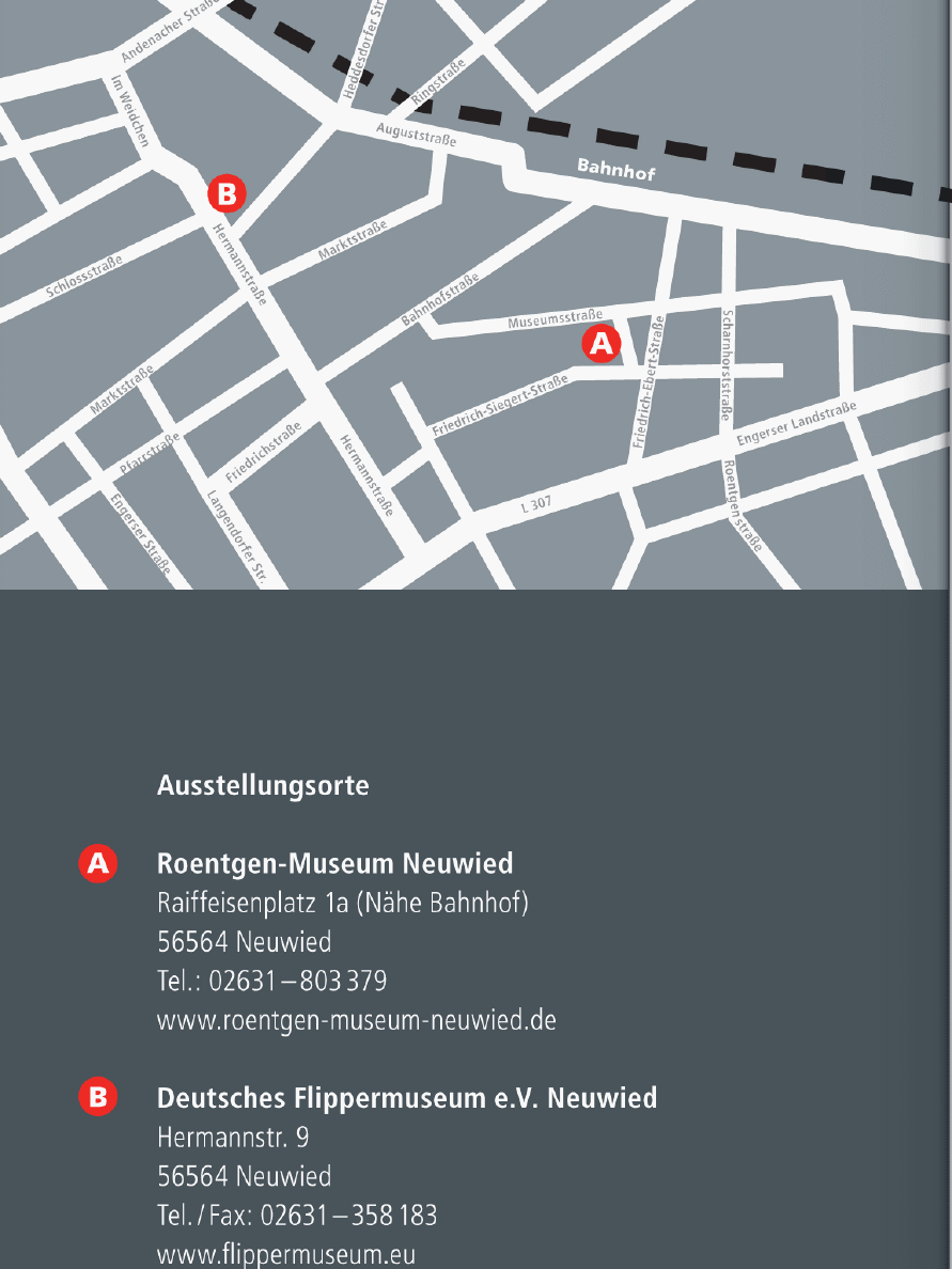 Sowohl das Roentgen-Museum als auch das Flippermuseum sind gut mit öffentlichen Verkehrsmitteln erreichbar. Beide Museen liegen fußläufig zum Neuwieder Bahnhof.
